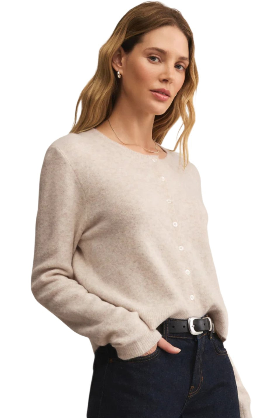 This relaxed crewneck cardigan is made from cozy sweater yarns with an easy button-up front that’s perfect for layering. Whether tossed over a tank or worn solo, it’s the ideal go-to for cozy, casual days.